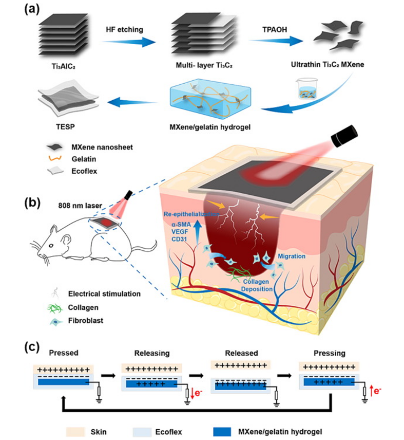 圖2. TENG電子皮膚貼片(TESP)的制備及應(yīng)用示意圖。(a)用MXene/明膠水凝膠制備TESP。b)使用近紅外響應(yīng)mxene的TESP對傷口愈合的示意圖。(c)可穿戴式TESP的工作機理。