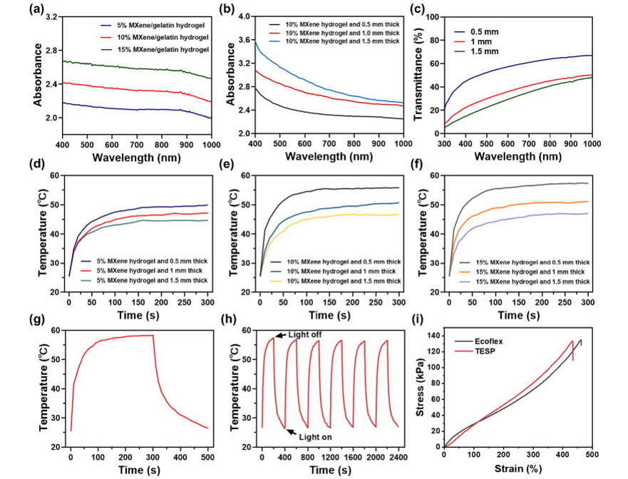 圖4. TESPs的光學、機械和光熱特性。(a)不同MXene含量的MXene/明膠水凝膠吸光度。(b) 10?% MXene水凝膠和不同Ecoflex厚度(0.5、1、1.5?mm)對TESP吸光度的影響。(c)不同厚度Ecoflex的透光率。(d-f)含5?%、10?%和15?% MXene的水凝膠和不同Ecoflex厚度的TESP在1?W?cm−2的808?nm近紅外激光照射下的光熱加熱曲線。(g)使用10?% MXene和1?mm Ecoflex水凝膠的貼片加熱和冷卻曲線。(h) TESP光熱循環(huán)。(i) Ecoflex彈性體薄膜與TESP的應(yīng)力應(yīng)變曲線。