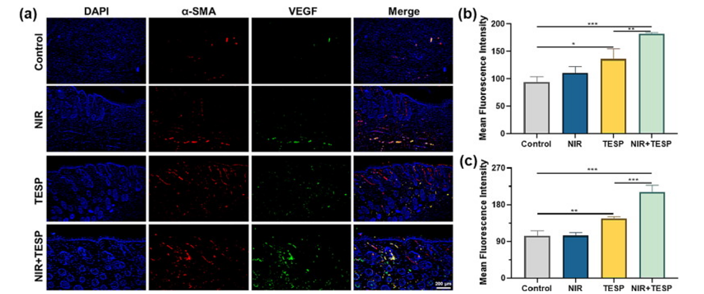 圖9. 第10天各組傷口組織中α-SMA和VEGF的表達(a)。細胞核用4,6-二氨基-2-苯基吲哚(DAPI,藍色)染色。α-SMA(紅色)和VEGF(綠色)的免疫熒光圖像。免疫熒光研究顯示,近紅外組TESP中α-SMA和VEGF的表達增加。右下角圖像中的比例尺適用于所有圖像。(b, c) α-SMA和VEGF的平均熒光強度(第10天)。