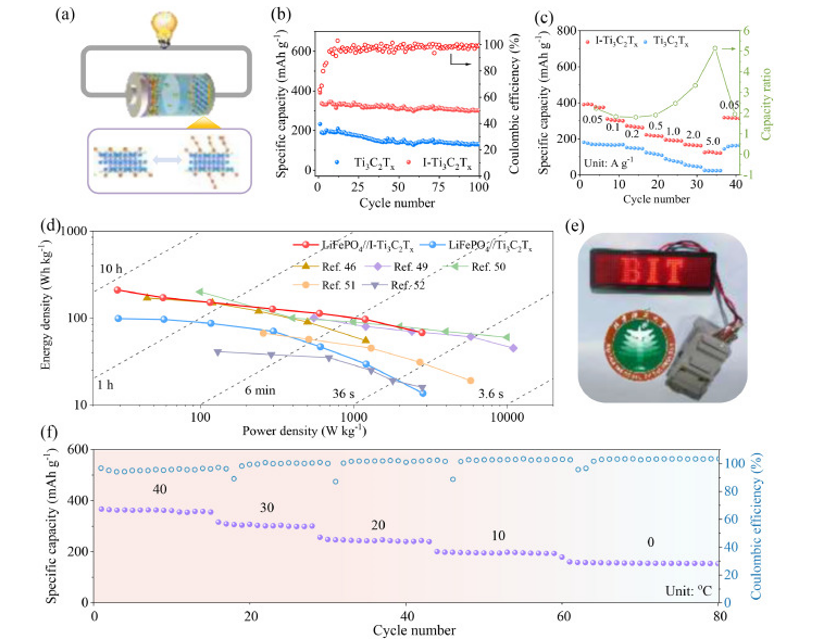圖6. LiFePO4//I−Ti3C2Tx的全電池性能。(a) LiFePO4//I−Ti3C2Tx中智能鋰離子傳輸通道示意圖。(b) LiFePO4//I−Ti3C2Tx和LiFePO4//Ti3C2Tx全電池的循環(huán)性能和(c)倍率性能。(d)基于Ti3C2Tx電極的LiFePO4//I−Ti3C2Tx、LiFePO4//Ti3C2Tx和已報道的基于Ti3C2Tx電極的全電池的重量能量密度與功率密度的Ragone圖。(e)光學(xué)圖像顯示了由組裝的LiFePO4//I−Ti3C2Tx全電池驅(qū)動的發(fā)光LED屏幕。(f)活化后LiFePO4//I−Ti3C2Tx在0 ~ 40℃范圍內(nèi)電流密度為0.1 A g−1時的循環(huán)性能。