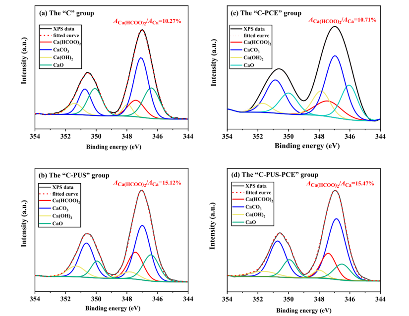 圖7. 不同樣品水泥漿中氧化石墨烯的C原子能譜圖結果:(a)“C”基團,(b)“C-PCE”基團,(C)“C-PUS”基團,以及(d)“C-PCE-PUS”組。