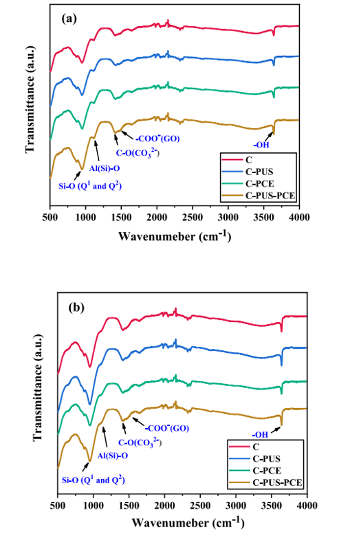 圖13. 氧化石墨烯改性水泥的FTIR光譜:(a)1天,(b)28天。