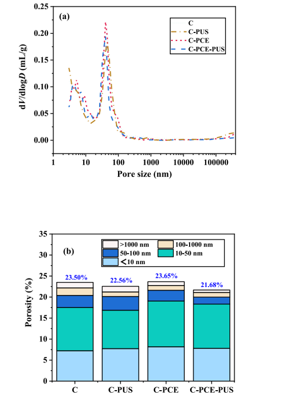 圖14. 不同樣品在28d時的孔隙結構。(a)差異孔徑曲線,(b)孔隙率。