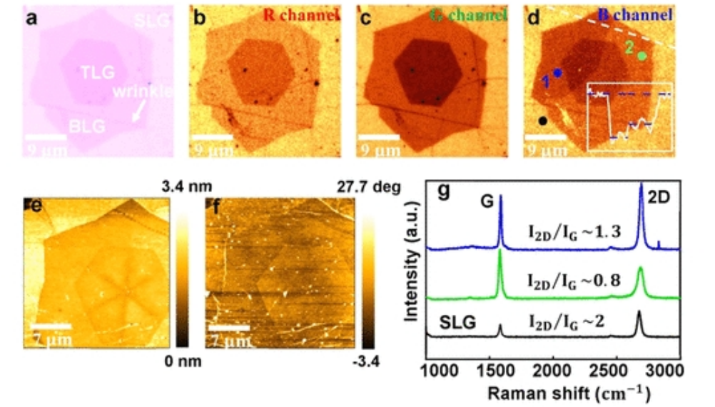 2/Si襯底上轉(zhuǎn)移的CVD生長的多層石墨烯的光學(xué)圖像。(b–d)R、G和b通道對應(yīng)于(a)中的光學(xué)圖像。(d)中的插圖顯示了白色虛線的反射強(qiáng)度分布。(e,f)(a)中相同石墨烯疇的AFM形貌圖像(e)和相位圖像(f)。(g) (d)中標(biāo)記的色斑的拉曼光譜。