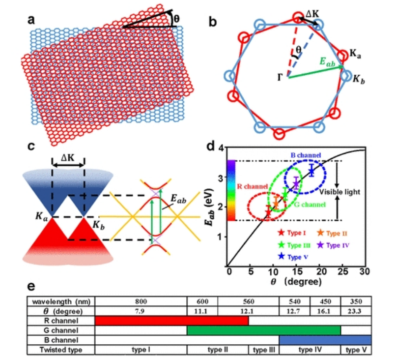 圖3. (a) 旋轉(zhuǎn)堆疊的雙層石墨烯的示意圖,其中一層位于另一層的頂部。頂層和底層以一般角度θ相互旋轉(zhuǎn)。(b) 堆疊的石墨烯層的第一布里淵區(qū)如(a)所示。(c) TBG的能帶結(jié)構(gòu)圖和耦合Dirac錐的示意圖。兩個K點(diǎn)中間的雜交平坦帶之間的光學(xué)躍遷由綠色箭頭指示。(d) 扭曲角θ相關(guān)的Eab曲線如黑色實(shí)線所示。扭曲角θ根據(jù)其在RGB通道中的能量分散光學(xué)行為可分為五種類型。(e) 具體的五種類型的扭曲角是根據(jù)它們對應(yīng)的最大吸收能量Eab和RGB通道的波長范圍來識別的。