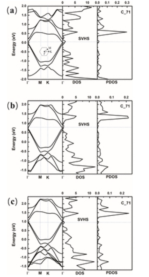 0)=−2.5 e時計算的能帶結(jié)構(gòu)、DOS和PDOS。