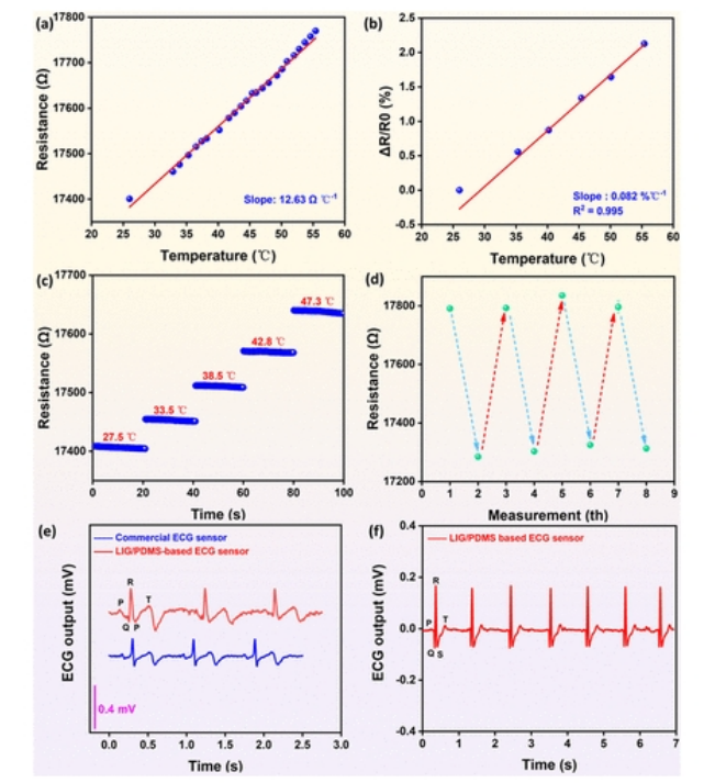 圖6.(a) 當(dāng)溫度從26°C上升到55°C時,溫度傳感器對電阻變化的響應(yīng)。(b) 隨著溫度從26°C升高到55°C,溫度傳感器的相對正電阻變化。(c) 溫度傳感器對27.5至47.3°c的增量溫度的動態(tài)電阻響應(yīng)。(d) 通過在20°C和60°C之間重復(fù)加熱-冷卻測試,溫度傳感器的可恢復(fù)性。(e) 通過商用ECG傳感器(濕)和基于LIG/PDMS的ECG傳感器(干)測量ECG信號。(f) 通過基于LIG/PDMS的ECG傳感器測量胸部的ECG信號。