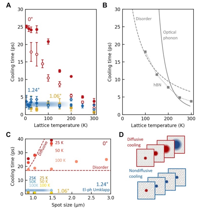 Fig 2. MATBG 和 BLG 中的弛豫機制。 (A) 冷卻時間與晶格溫度的關系。在 MATBG(1.24°,藍色加號;1.06°,黃色方塊)中,冷卻時間在 5 到 300 K 之間恒定(3 ps;藍線)。對于 BLG(0°,紅色圓圈),它在較低溫度下更大。實心(空心)符號對應于 TrPV (CWPM) 測量。誤差線代表不同柵極電壓的統(tǒng)計分布。 (B) 基于 (55) 的光學聲子發(fā)射、基于 (36, 37) 的 hBN 雙曲聲子散射和基于 (31, 33, 34) 的無序輔助散射計算的冷卻時間。對于所有機制,在較低溫度下冷卻速度較慢。 (C) 冷卻時間對激光光斑尺寸的依賴性。 BLG 在 25 和 50 K 時的強烈依賴性是擴散冷卻的標志。這種效應在 100 K 時較弱,此時無序輔助冷卻變得顯著。對于這些光斑尺寸,MATBG 中不存在這種影響。 (A) 和 (C) 中的藍色粗線表示從 Umklapp 輔助冷卻的低溫模型獲得的冷卻時間(參見正文)。 (D) BLG 的擴散冷卻示意圖(頂部)和 MATBG 不存在擴散冷卻的示意圖(底部)。