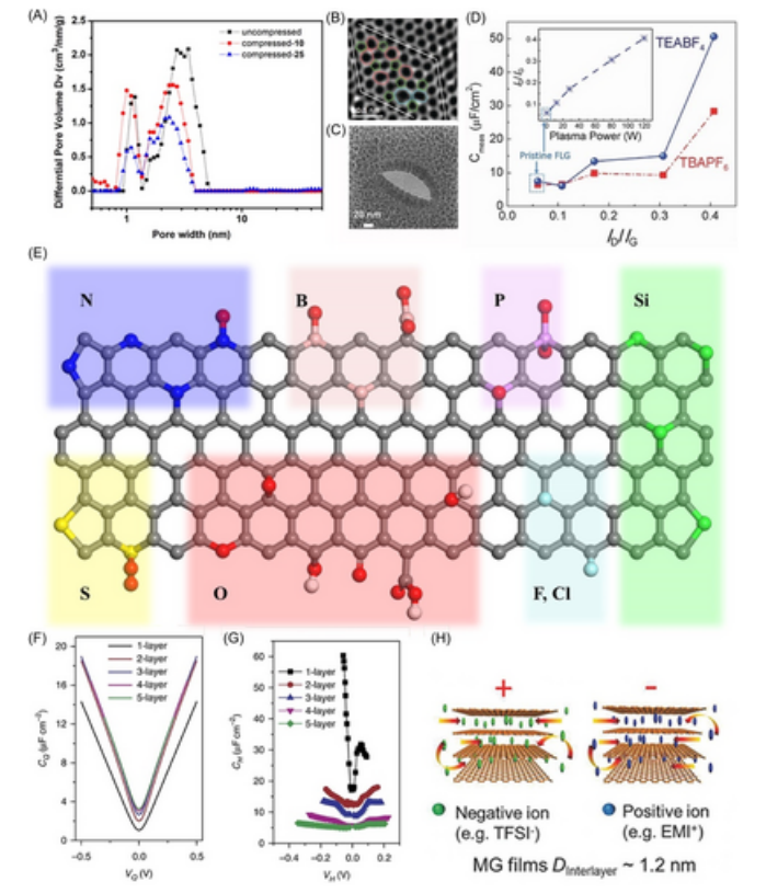 IG 隨著等離子體功率的增加而增加。 (E) 石墨烯中的雜原子摻雜。 (F) 量子電容和 (G) 6 M KOH 水溶液中的亥姆霍茲電容與電壓的關(guān)系,具體取決于多層石墨烯 (MLG) 的層數(shù)。 (H) MLG中離子嵌入的示意圖。