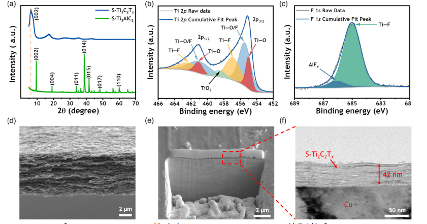 圖2. S-Ti3C2Tx 和 S-Ti3C2Tx@Cu 的表征。A) S-Ti3AlC2 MAX 前驅(qū)體和 S-Ti3C2Tx MXene 的 XRD 圖譜。B) Ti _ 2p 和 c) F _ 1s 高分辨 X 射線光電子能譜(S-Ti3C2Tx)。D)真空過濾 S-Ti3C2Tx 薄膜的斷面掃描電鏡圖像。E) S-Ti3C2Tx@Cu 的 FIB 橫截面圖像。F) S-Ti3C2Tx@Cu 的橫截面透射電鏡圖像。