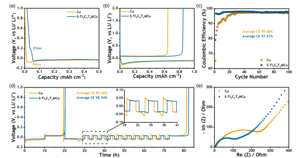 圖5. Cu/Li和S-Ti3C2Tx@Cu/Li不對稱電池的電化學表征。a)電流密度為50 μA cm−2的恒流鍍鋰金屬型材。b)在0.5 mA cm−2電流密度下,第一個循環(huán)中鋰沉積/剝離的電壓分布圖。c) 0.5 mA cm−2電流密度下鋰沉積/剝離的庫侖效率。d)電流密度為0.5 mA cm−2時的電壓隨時間曲線。e)電池在(d)中循環(huán)后的電化學阻抗譜,頻率范圍為0.01 ~ 500000 Hz,正弦電位信號為50 mV。