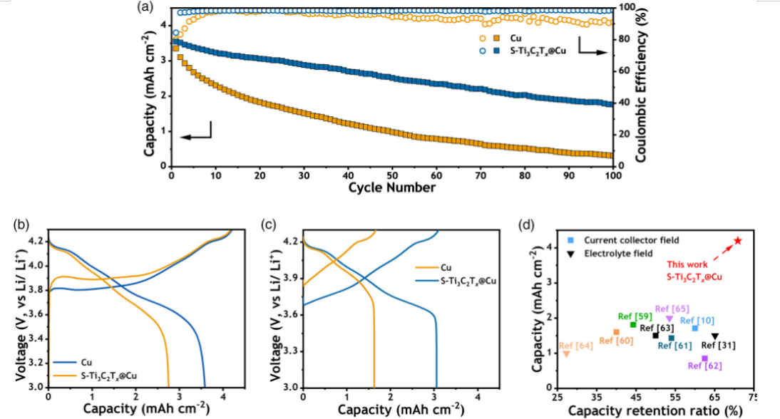 圖6. 含Cu和S-Ti3C2Tx@Cu集流器的無陽極硬幣電池在實際條件下的電化學性能。a)無陽極NCM811全電池循環(huán)性能圖。b)無陽極NCM811全電池第一次循環(huán)的電壓分布圖。c)無陽極NCM811全電池第20次循環(huán)的電壓分布圖。d)本工程與以往工程50次循環(huán)后保證穩(wěn)定運行的初始面積容量和容量保持率的比較。無陽極電池在0.84 mA cm−2的固定電流密度下工作,相當于0.2 C的速率。