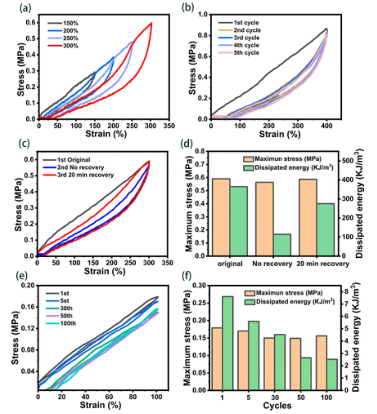 Fig 3. (a) 不同應(yīng)變下 PPM1P-OH 有機水凝膠的連續(xù)加載-卸載。 (b) 五個加載-卸載循環(huán),兩次連續(xù)測試之間沒有休息間隔。 (c) 具有不同休息時間的 300% 應(yīng)變的拉伸循環(huán)應(yīng)力-應(yīng)變曲線。 (d) (c) 中每個循環(huán)的最大應(yīng)力和耗散能量。 (e) 100% 拉伸應(yīng)變下 100 個循環(huán)。 (f) (e) 中循環(huán)的最大應(yīng)力和耗散能量。