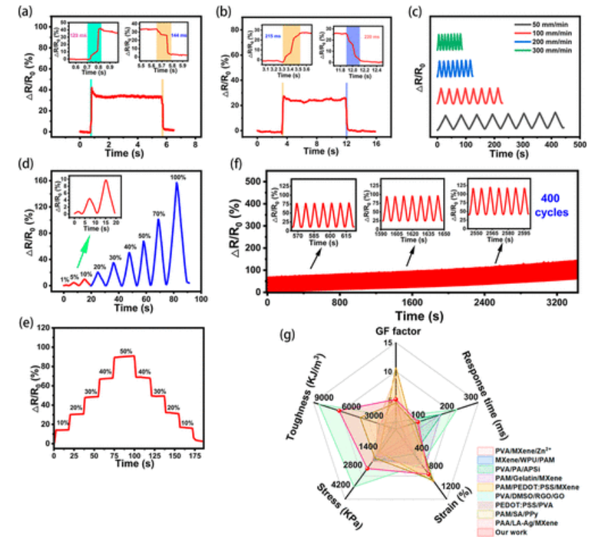Fig 6. (a) PPMP 水凝膠在 30% 應(yīng)變下的響應(yīng)時間和恢復(fù)時間。 (b) PPM-OH水凝膠柔性應(yīng)變傳感器在不同應(yīng)變下的相對電阻變化。不同拉伸速率下ΔR/R0的變化[部分(c)和不同應(yīng)變(d)]。 (e) 逐步伸長和釋放過程中ΔR/R0隨時間的變化。 (f) 50%應(yīng)變下重復(fù)加載-卸載過程400個循環(huán)下的ΔR/R0響應(yīng)。 (g)我們的PPMP-OH有機水凝膠與其他報道的水凝膠或有機水凝膠之間的綜合性能比較。