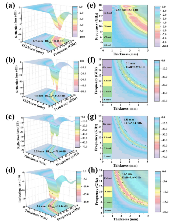 圖3. (a,e) HCCM-600、(b,f) HCCM-700、(c,g) HCCM-800、(d,h) HCCM-900 的 3D 曲線和2D 映射。