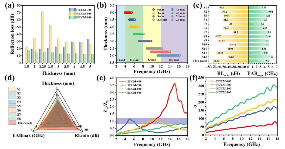 圖4. (a) HCCM-700/800/900在不同匹配厚度下的RL值。 (b) HCCM-800 在選定厚度下的 EAB。 MA 性能與其他吸收劑(c)具有相似結(jié)構(gòu)和(d)由先前報(bào)道的基于 MXene 或 MOF 衍生物制成的吸收劑的比較。 (e) HCCM-600/700/800/900 在優(yōu)化厚度下的 Zin/Z0 值。 (f) HCCM-600/700/800/900在2–18 GHz范圍內(nèi)的α值。