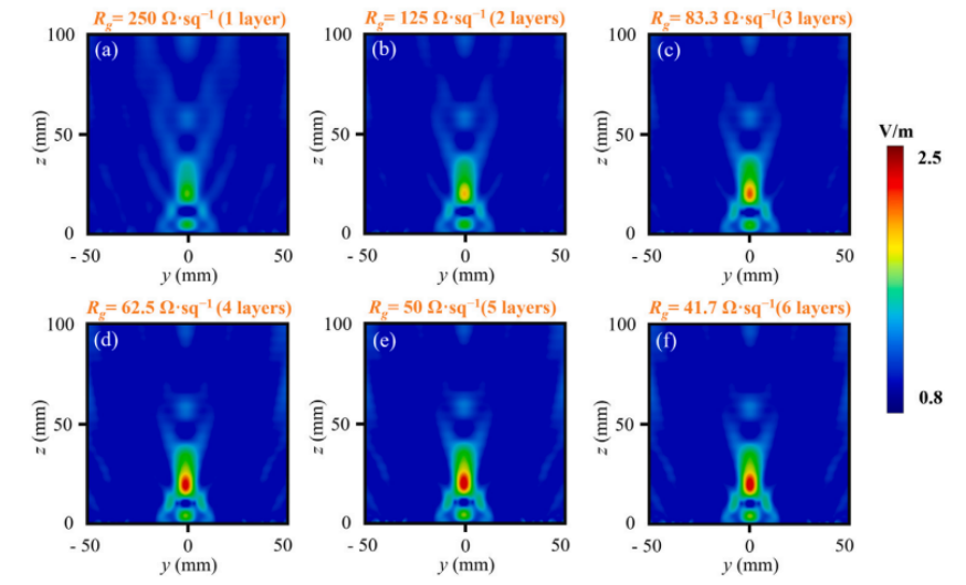 圖3. 模擬了( a )單層、( b )雙層、( c )三層、( d )四層、( e )五層和( f )六層石墨烯透鏡在30 GHz電磁波照射下的電場分布。