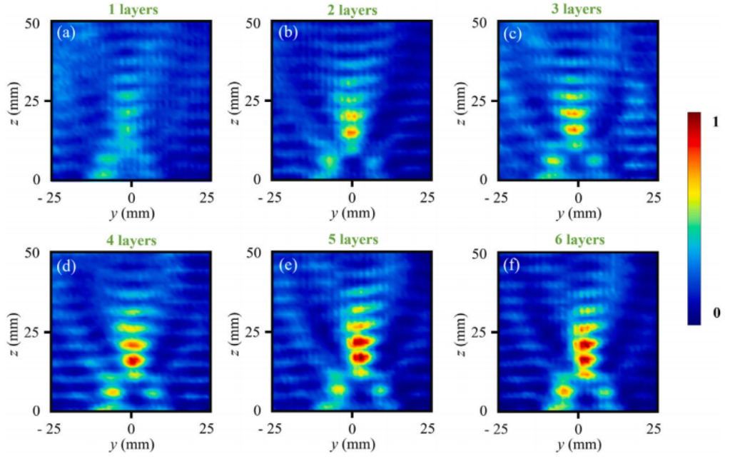 圖6. 測量30GHz波照射(a)一、(b)二、(c)三、(d)四、(e)五、和(f)六層石墨烯透鏡后的電場分布。