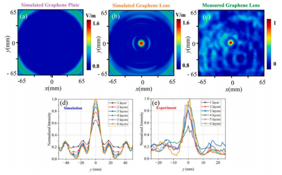 圖8. 在z = 30 mm處,歸一化幅度:( a )模擬三層石墨烯板,( b )模擬三層石墨烯透鏡,( c )測量三層石墨烯透鏡的電場。在x = 0和z = 30 mm條件下,比較歸一化場強隨y的變化:( d )模擬,( e )測量。在所有的情況下,透鏡都是由一個30 GHz的平面波激發(fā)的。