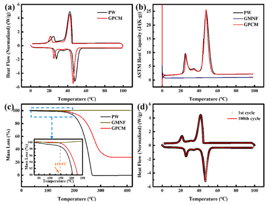 圖3. (a) PW和GPCM的DSC曲線;(b)PW、GMNF、GPCM的比熱容曲線;(c)PW、GMNF、GPCM的TG曲線;(d)100次循環(huán)試驗前后GPCM的DSC曲線。