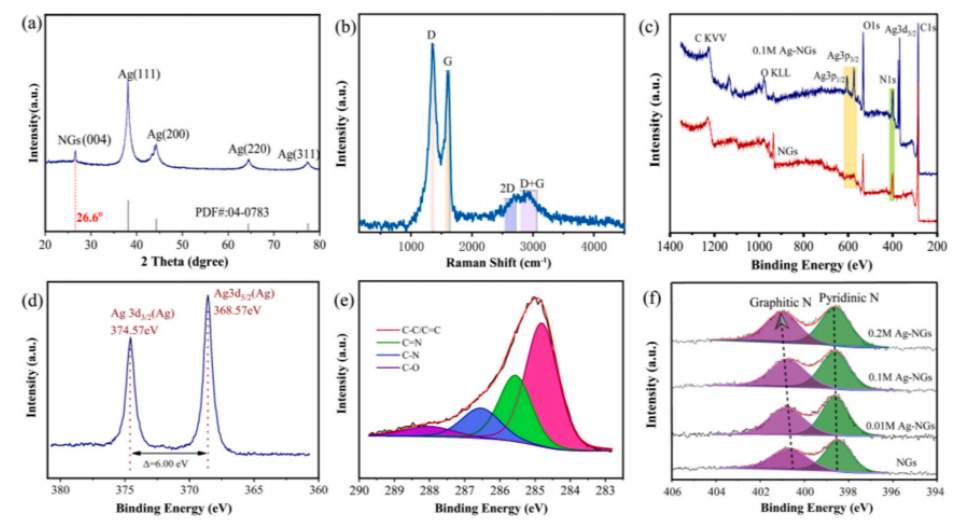 圖3. Ag - NGs納米復(fù)合材料的晶體結(jié)構(gòu)、組分和價(jià)鍵表征。(a)XRD模式;(b)拉曼光譜;(c)XPS光譜;(d)高分辨率Ag3d圖譜;(e)高分辨率C1s圖譜;(f)高分辨率N1s圖譜。