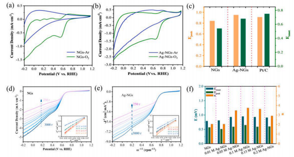 -1)中,以不同轉(zhuǎn)速( 250 - 3000轉(zhuǎn)/分)記錄ORR的線性掃描伏安曲線(LSVs),插圖是背景校正后NGs和Ag - NGs的相應(yīng)K-L圖;(f)不同Ag濃度下Ag - NGs復(fù)合物的E