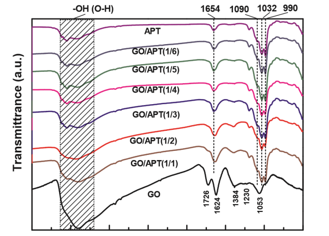 Fig 3. GO、APT和GO/APT復(fù)合材料的FT-IR光譜。