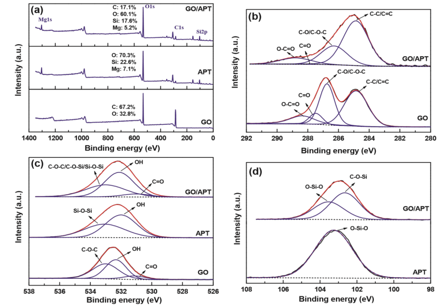 Fig 4. (A)GO,APT,GO/APT(1/4)復(fù)合材料的XPS測量,以及相應(yīng)的(B)C 1s,(C)O 1s和(D)Si 2p譜。圖中顯示了原始數(shù)據(jù)(黑線)、背景(黑虛線)、擬合線(紅線)和去卷積峰(藍(lán)線)。