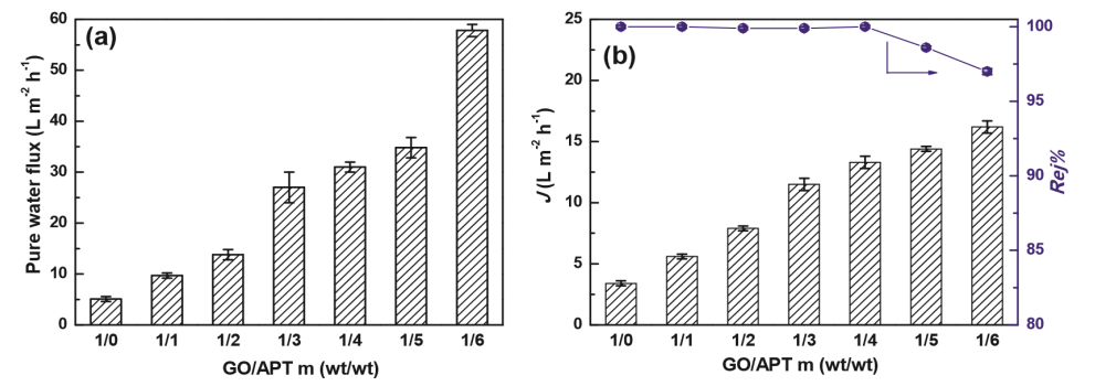 −1)中,GO/APT比對(A)純水通量和(B)分離性能的影響。