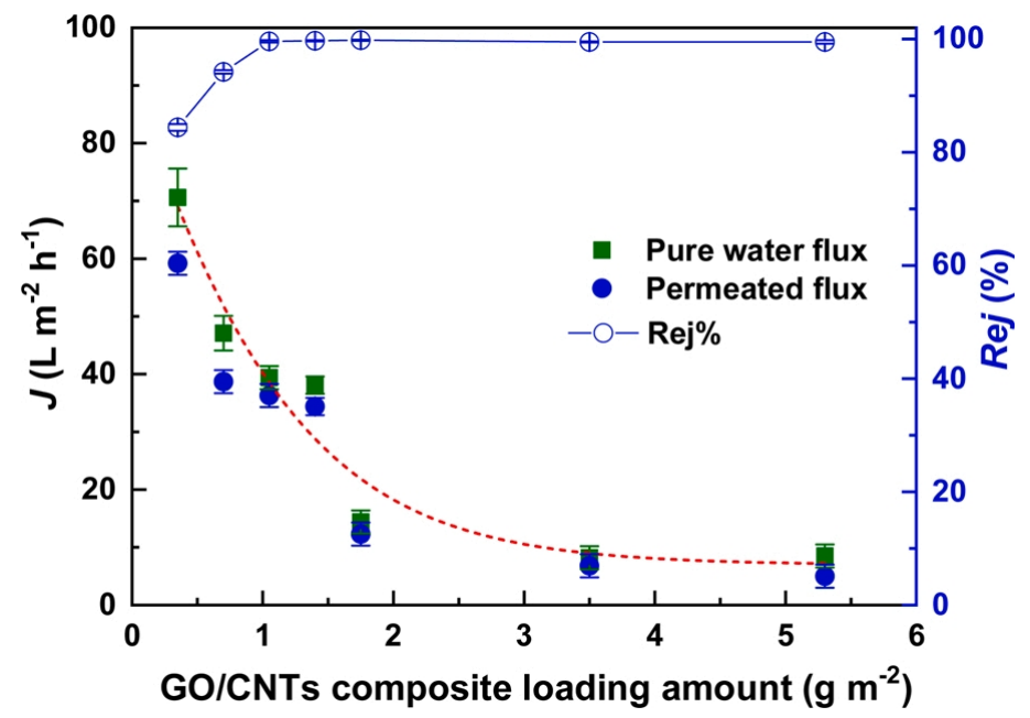 通過將一維羧基化多壁碳納米管(MWCNTs-COOH)插入二維氧化石墨烯(GO)納米片中,可以輕松制備出具有精細(xì)分級納米結(jié)構(gòu)的GO/CNTs復(fù)合膜,用于高效的有機(jī)廢水處理。通過XRD、Raman、FTIR、TEM和水接觸角的表征結(jié)果,MWCNTs-COOH通過接枝反應(yīng)成功插入到GO層狀中間層中,從而提高了水的滲透通量和膜的穩(wěn)定性。針對亞甲基藍(lán)染料溶液,系統(tǒng)研究了GO/CNTs比例、負(fù)載量、CNTs類型和載體類型對膜分離性能的影響。在優(yōu)化條件下制備的GO/CNTs復(fù)合膜在0.9 bar的跨膜壓差下,對亞甲基藍(lán)溶液的滲透通量分別為34.4 L m