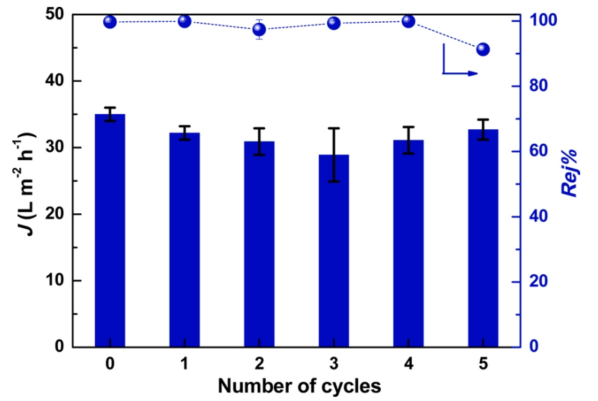 -1和99.7%以上的截留率。與原始GO膜相比,它的水滲透通量提高了近10倍,同時(shí)保持了高截留率。此外,靜電相互作用和尺寸排阻效應(yīng)協(xié)同作用,導(dǎo)致GO/CNTs膜對不同帶正/負(fù)電荷的染料和中性有機(jī)分子的有效分離性能。這種GO/CNTs膜還表現(xiàn)出良好的耐酸性化學(xué)穩(wěn)定性和高效的分離性能。