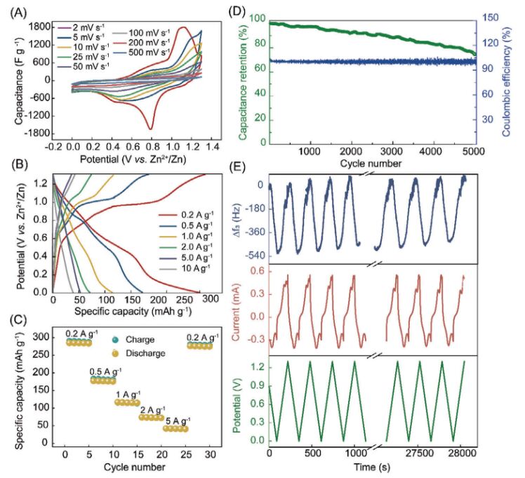 圖 5. Zn//T-V = 1:5 電池在 0–1.3 V 范圍內(nèi)循環(huán)的電化學(xué)性能。A) 不同掃描速率下的 CV 曲線。 B) 電流密度從0.2到10 A g−1的充放電曲線。 C) 評價(jià)績效。 D) 循環(huán)壽命性能。 E) EQCM-D 參數(shù)的時(shí)間依賴性:施加的電位、電流和頻率。