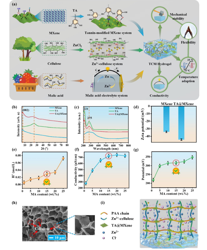 圖1.(a)中藥水凝膠制備示意圖。 MXene 和 TA@MXene 納米片的 (b) XRD、(c) 紫外-可見光譜和 (d) zeta 電位。 MA 溶液的 (e) H+ 濃度、(f) 電導率和 (g) 氧化還原電位 (ORP)。 (h) 凍干水凝膠的 SEM 圖像。 (i) 中藥水凝膠的離子遷移通道。