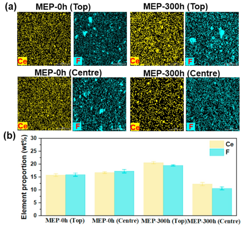 圖 7 MEP-3 wt% 中 F 和 Ce 的表面和內(nèi)部分布。