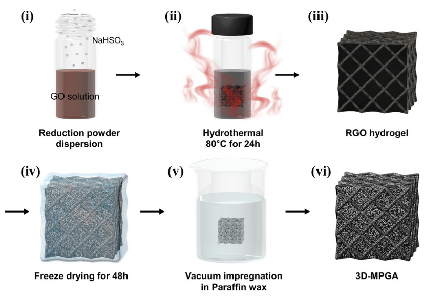 圖2. 3D-MPGA 的制造過程。使用3D打印技術(shù)制造基于八位桁架晶胞的晶格,并使用水熱工藝在八位桁架晶格結(jié)構(gòu)內(nèi)直接合成還原氧化石墨烯(RGO)水凝膠,從而將RGO水凝膠納入八位體桁架結(jié)構(gòu)。順序冷凍干燥完成了石墨烯氣凝膠 (GA) 和 3D 打印的八角桁架結(jié)構(gòu)的混合結(jié)構(gòu)。最后,采用真空浸漬法將PCM(石蠟)滲透到GA中,得到3D-MPGA。