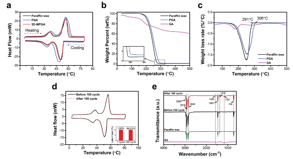 圖 4. 石蠟、GA、PGA 和 3D-MPGA 的熱特性和穩(wěn)定性。 a) 石蠟、PGA 和 3D-MPGA 在 5 至 80 °C 范圍內(nèi)的差示掃描量熱 (DSC) 曲線。 b) 熱重分析 (TGA) 和 c) 25 至 500 °C 下石蠟、GA 和 PGA 相應(yīng)的導(dǎo)數(shù)熱重 (DTG) 熱分析圖。 d)3D-MPGA在5-80°C下100個循環(huán)之前和之后的DSC曲線。 e) 石蠟、GA 和 3D-MPGA 在 100 次循環(huán)之前和之后的傅里葉變換紅外光譜 (FT-IR) 分析。