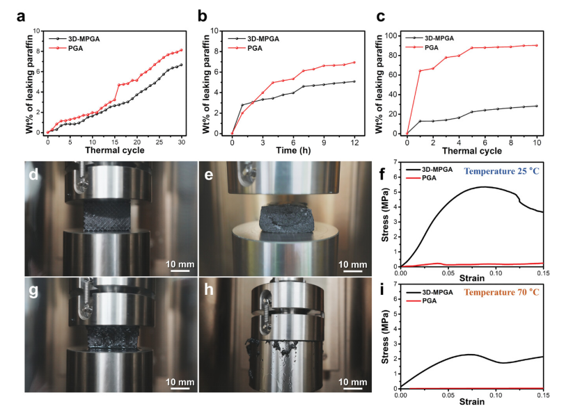 圖5. PGA 和 3D-MPGA 在固態(tài)和液態(tài) PCM 中針對外部機械負(fù)載的防泄漏和形狀穩(wěn)定性。 a) PGA 和 3D-MPGA 在 25 和 70 °C 下 30 個熱循環(huán)(每次 5 分鐘)的 PCM 泄漏率。 b) PGA 和 3D-MPGA 在 70 °C 下 12 小時內(nèi)的 PCM 泄漏率。 c) PGA 和 3D-MPGA 在 25 和 70 °C 下經(jīng)過 10 個每次 5 分鐘的熱循環(huán),承受 1 kg 的機械負(fù)載時的 PCM 泄漏率。 d) 3D-MPGA 和 e) PGA 的機械壓縮測試照片,以及 f) 25 °C 下的壓縮應(yīng)力-應(yīng)變曲線。 g) 3D-MPGA 和 h) PGA 的機械壓縮測試照片,以及 i) 70 °C 下的壓縮應(yīng)力-應(yīng)變曲線。