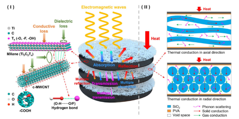 通過將二氧化硅納米纖維膜(SNM)與 MXene@c-MWCNT 混合薄膜相結(jié)合,制造出一種輕質(zhì)、柔性、熱穩(wěn)定的復(fù)合材料。由原硅酸四乙酯水解縮合,通過靜電紡絲和高溫煅燒制備出具有優(yōu)異隔熱性能的柔性SNM; MXene@c-MWCNTx:y 薄膜是通過真空過濾技術(shù)制備的。特別是,SNM 和 MXene@c-MWCNT6:4 作為一個單元層(SMC1)與 5 wt% 聚乙烯醇(PVA)溶液粘合在一起,具有低導(dǎo)熱率(0.066 W m−1 K−1)和良好的電磁干擾(EMI)屏蔽性能(平均EMI SET,37.8 dB)。隨著功能單元層數(shù)的增加,整個復(fù)合薄膜(SMCx)的整體隔熱性能保持穩(wěn)定,EMI屏蔽性能大大提高,特別是對于具有三個單元層的SMC3,平均EMI SET高達(dá)55.4 分貝。此外,剛性SNM和堅韌MXene@c-MWCNT6:4的有機結(jié)合使SMCx表現(xiàn)出良好的機械拉伸強度。重要的是,即使在極熱和極冷的環(huán)境下,SMCx 也能表現(xiàn)出穩(wěn)定的 EMI 屏蔽和出色的隔熱性能。因此,該工作為未來極端環(huán)保設(shè)備中使用的EMI屏蔽和隔熱組件提供了新穎的設(shè)計思路和重要的參考價值