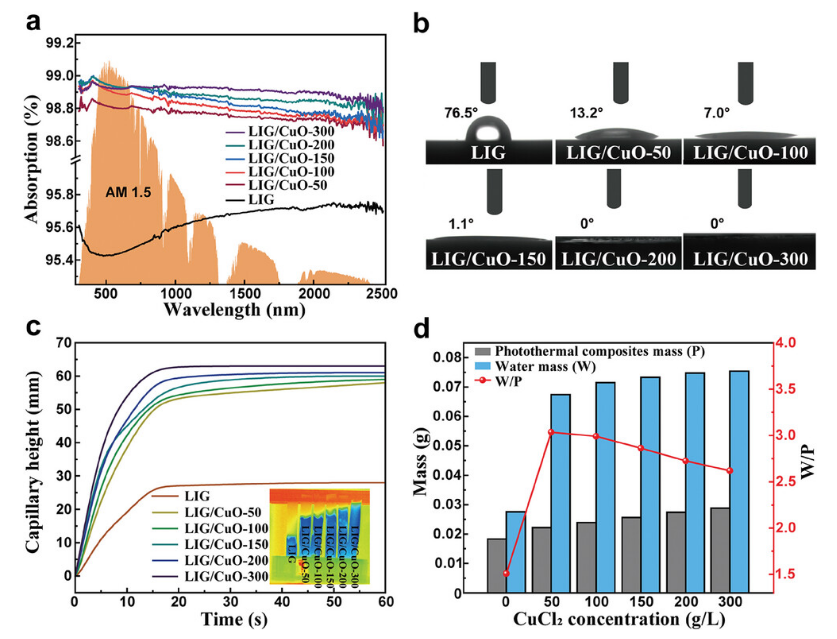 Fig 3. a) LIG 和多孔 LIG/CuO 復(fù)合材料的吸光率。與純 LIG 相比,多孔 LIG/CuO 復(fù)合材料的吸光率得到了適度改善。c) 毛細管高度和 d) LIG 和多孔 LIG/CuO 復(fù)合材料的吸水性能。LIG 的內(nèi)部多孔結(jié)構(gòu)和石墨烯表面的 CuO 微簇提高了材料的水傳輸性能。