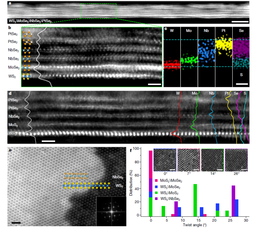 圖 3. 多塊 vdWSH 薄膜的晶體結(jié)構(gòu)。a,堆疊生長(zhǎng)的 1L WS2\1L MoSe2\2L NbSe2\2L PtSe2(共六層)的特寫(xiě)橫截面 STEM 圖像。比例尺,5 納米。b,顯示強(qiáng)度分布(白線(xiàn))的特寫(xiě)橫截面 STEM 圖像。比例尺,1 納米。c,W、Mo、Nb、Pt、S 和 Se 的相應(yīng) EDS 元素映射。水平虛線(xiàn)之間的元素分布對(duì)應(yīng)于 b 中的原子結(jié)構(gòu)。d,由 1L WS2、1L MoS2、1L NbSe2 和 2L PtSe2(共五層)組成的薄 vdWSH 的典型橫截面 STEM 圖像。左側(cè)的白線(xiàn)是強(qiáng)度分布。右側(cè)顯示了 W、Mo、Nb、Pt、S 和 Se 的 EDS 強(qiáng)度光譜。比例尺,1 納米。e,在部分分離的 WS2\NbSe2 薄膜的厚度轉(zhuǎn)變區(qū)域獲得的典型平面內(nèi) STEM 圖像。右下角的插圖顯示了雙塊區(qū)域相應(yīng)的快速傅里葉變換圖案,扭曲角約為 0°。比例尺,1 納米。f,圖表顯示了堆疊生長(zhǎng)的 WS2\NbSe2、WS2\MoS2、WS2\MoSe2 和 MoS2\MoSe2 雙層中具有不同扭曲角的莫爾超晶格的比例。插圖顯示了具有不同扭曲角的莫爾超晶格的典型 STEM 圖像。比例尺,1 納米。