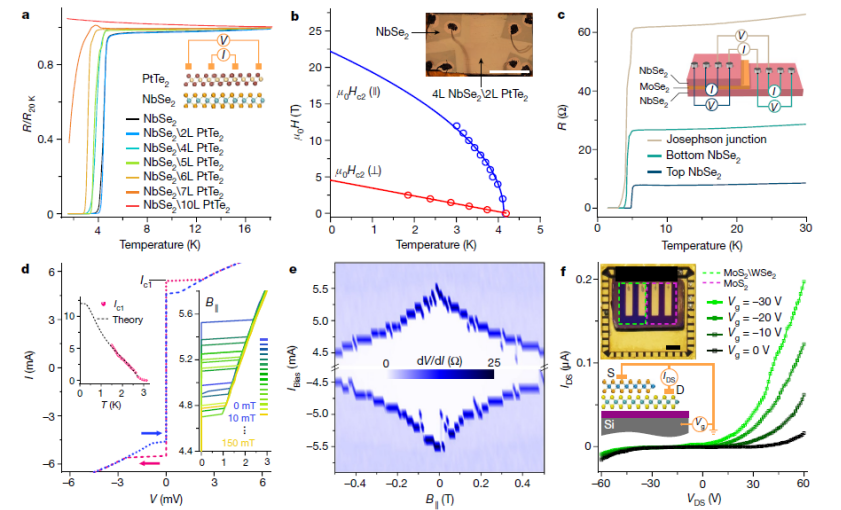 圖 4. 堆疊生長(zhǎng)的 vdWSH 薄膜的層間耦合。a,堆疊生長(zhǎng)的 NbSe2\PtTe2 薄膜的電阻溫度依賴(lài)性,其中 PtTe2 厚度不同。插圖顯示了電極設(shè)置。b,平面內(nèi)(藍(lán)色)和平面外(紅色)磁場(chǎng)下上臨界場(chǎng) Hc2 的溫度依賴(lài)性。實(shí)線(xiàn)是根據(jù) Ginzburg-Landau 理論擬合的。插圖是毫米級(jí) vdWSH 薄膜的典型光學(xué)圖像。比例尺,2 毫米。μ0,真空磁導(dǎo)率。c,4L NbSe2\2L MoSe2\4L NbSe2 薄膜中頂部和底部 4L NbSe2 的電阻溫度依賴(lài)性,以及頂部和底部 NbSe2 之間的結(jié)電阻。插圖顯示了 vdWSH 薄膜的四探針電測(cè)量裝置。 d、在 1.5 K 下測(cè)量的堆疊生長(zhǎng) 4L NbSe2\2L MoSe2\4L NbSe2 vdWSH 薄膜的 I-V 特性。箭頭表示電流的掃描方向。左側(cè)插圖顯示臨界電流 Ic1 的溫度依賴(lài)性。虛線(xiàn)按照Ambegaokar-Baratoff 關(guān)系擬合。右側(cè)插圖顯示在不同 B∥ 下測(cè)量的放大比例的 I-V 曲線(xiàn)。e,在 1.5 K 溫度下 4L NbSe2\2L MoSe2\4L NbSe2 的微分電阻對(duì)偏置電流 (IBias) 和 B∥ 的依賴(lài)關(guān)系。f,在大型 3L MoS2\4L WSe2 p-n 結(jié)中測(cè)量的不同 Vg 下的 IDS-VDS 曲線(xiàn)。頂部插圖是制造的器件的光學(xué)圖像,金屬觸點(diǎn)之間的間距為 1 毫米。比例尺,2 毫米。底部插圖顯示了雙探針電氣測(cè)量的裝置。S,源極;D,漏極。