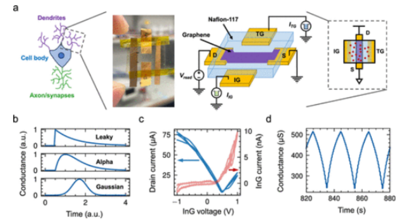 模擬神經(jīng)形態(tài)計算系統(tǒng)模擬人類大腦的并行性和連通性,與數(shù)字系統(tǒng)相比,具有更大的表達能力和能源效率。雖然許多設備已經(jīng)成為人工神經(jīng)元和人工突觸的候選設備,但人工樹突的候選設備很少。在這項工作中,我們報道了生物相容性石墨烯基人工樹突(梯度),可以實現(xiàn)樹突加工。通過使用雙側柵極結構,通過Nafion膜施加的電流可用于控制三層石墨烯通道上的器件電導,顯示泄漏循環(huán)、α和高斯樹突電位的時空響應。這些設備可以通過可變連接來實現(xiàn)高階神經(jīng)元響應,我們通過數(shù)據(jù)驅動的尖峰神經(jīng)網(wǎng)絡模擬表明,在低頻運行穩(wěn)定的情況下,尖峰活動減少了≤15%,而精度沒有損失。這使得畢業(yè)生成為節(jié)能生物界面脈沖神經(jīng)網(wǎng)絡的有力候選者。
