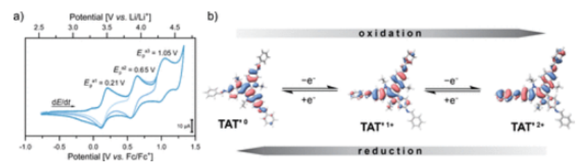+),以及 (b) TAT' 帶電態(tài),如 HOMO/SOMO 圖所示。
