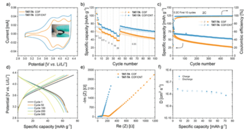 –1 時的 CV(第 10 周期)。(b) 費率能力。(c) 2°C速率下的循環(huán)穩(wěn)定性。(d) 2 C速率下TAT-TA COF/CNT電極的選定充放電曲線。(e) EIS測量的TAT-TA COF和TAT-TA COF/CNT電極的奈奎斯特圖。(f) 從TAT-TA COF/CNT電極的GITT測量中獲得的擴散系數(shù)。