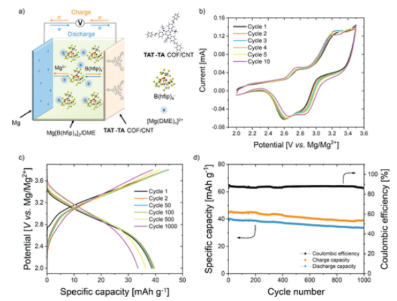 圖4. TAT-TA COF/CNT 電極(COF/CNT 的 1:2 wt 比例)在 Mg 基紐扣電池(0.3 M Mg[B(hfip)