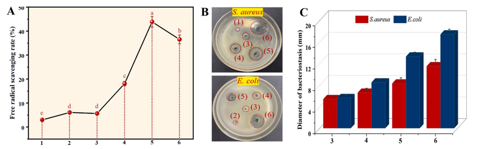 圖4. 薄膜的(A) 抗氧化活性,(B) 對(duì)金黃色葡萄球菌和大腸桿菌的抑制區(qū)圖片,以及 (C) 抗菌效率