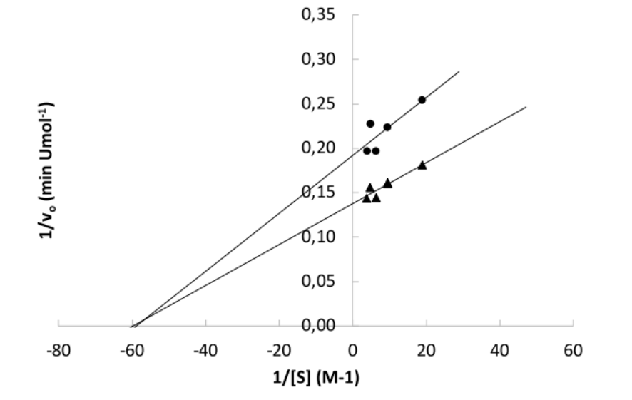 圖2. 不存在氧化石墨烯(三角形)和存在25 ppm氧化石墨烯(圓圈)時(shí)的Lineweaver-Burk圖。直線對(duì)應(yīng)于線性擬合。