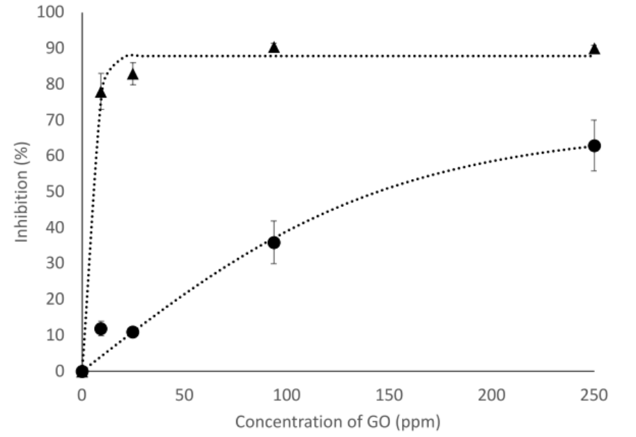 圖3. 在膽鹽(NaTC)存在(圓圈)或不存在(三角形)的情況下,不同濃度氧化石墨烯在2小時(shí)時(shí)對(duì)脂肪酶的抑制百分比。虛線只是為了說(shuō)明趨勢(shì)。誤差條表示標(biāo)準(zhǔn)差。