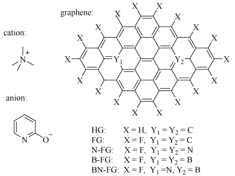圖1. [TMA][HPy]和石墨烯的陽(yáng)/陰離子結(jié)構(gòu)。