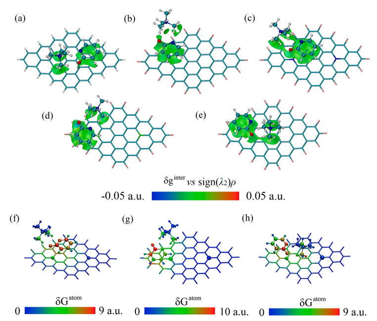 圖6. 不同[TMA][HPy]/石墨烯配合物的IGMH表面圖,(a) [TMA][HPy]/HG, (b) [TMA][HPy]/FG, (c) [TMA][HPy]/N-FG, (d) [TMA][HPy]/ B-FG, (e) [TMA][HPy]/BN-FG,并根據(jù)δG